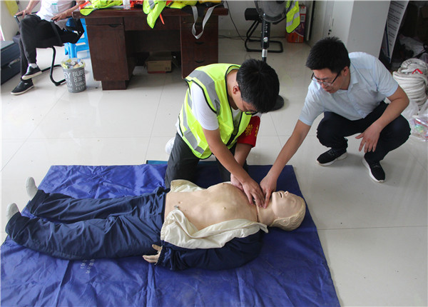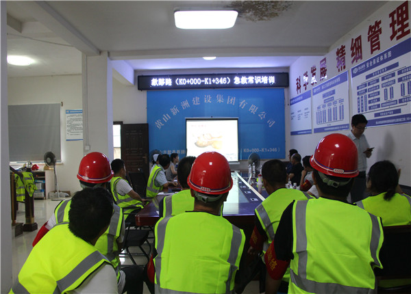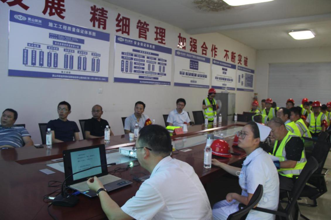 為確保演練順利進(jìn)行,項(xiàng)目經(jīng)理巴亮(現(xiàn)場(chǎng)指揮)組織多次預(yù)演,并邀請(qǐng)歙縣人民醫(yī)院專(zhuān)家于歙黟路項(xiàng)目部會(huì)議室進(jìn)行現(xiàn)場(chǎng)急救常識(shí)培訓(xùn)(止血方法、包扎、固定、搬運(yùn)等創(chuàng)傷技術(shù)、心肺復(fù)蘇急救方法等)。