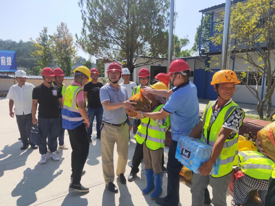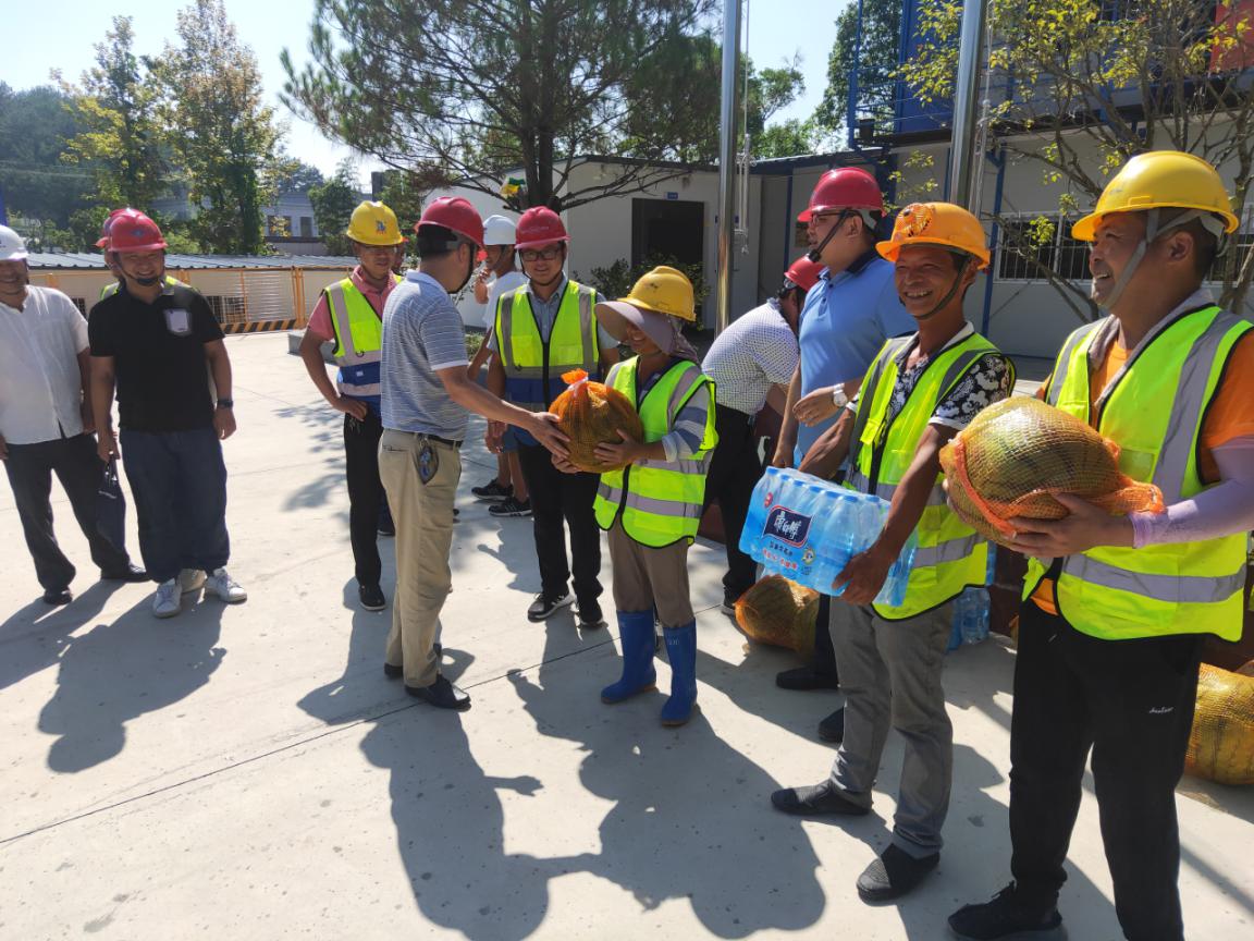 “大家辛苦了!大熱天里施工作業(yè)一定要注意防暑、注意安全”。市住建局副局長徐樹紅、建管處主任張先波一行一進入施工現場就對正在作業(yè)的農民工兄弟說道。為關懷一線建筑工人,加強高溫天氣下安全生產相關工作,8月18日上午,市住建局開展夏季高溫慰問送清涼活動,為在高溫下施工作業(yè)的工人們送來了防暑降溫用品。一瓶瓶礦泉水、一個個味甜個大的西瓜,為工人緩解暑熱,帶去一份清涼,收到慰問品的工人們都露出開心的笑容。
